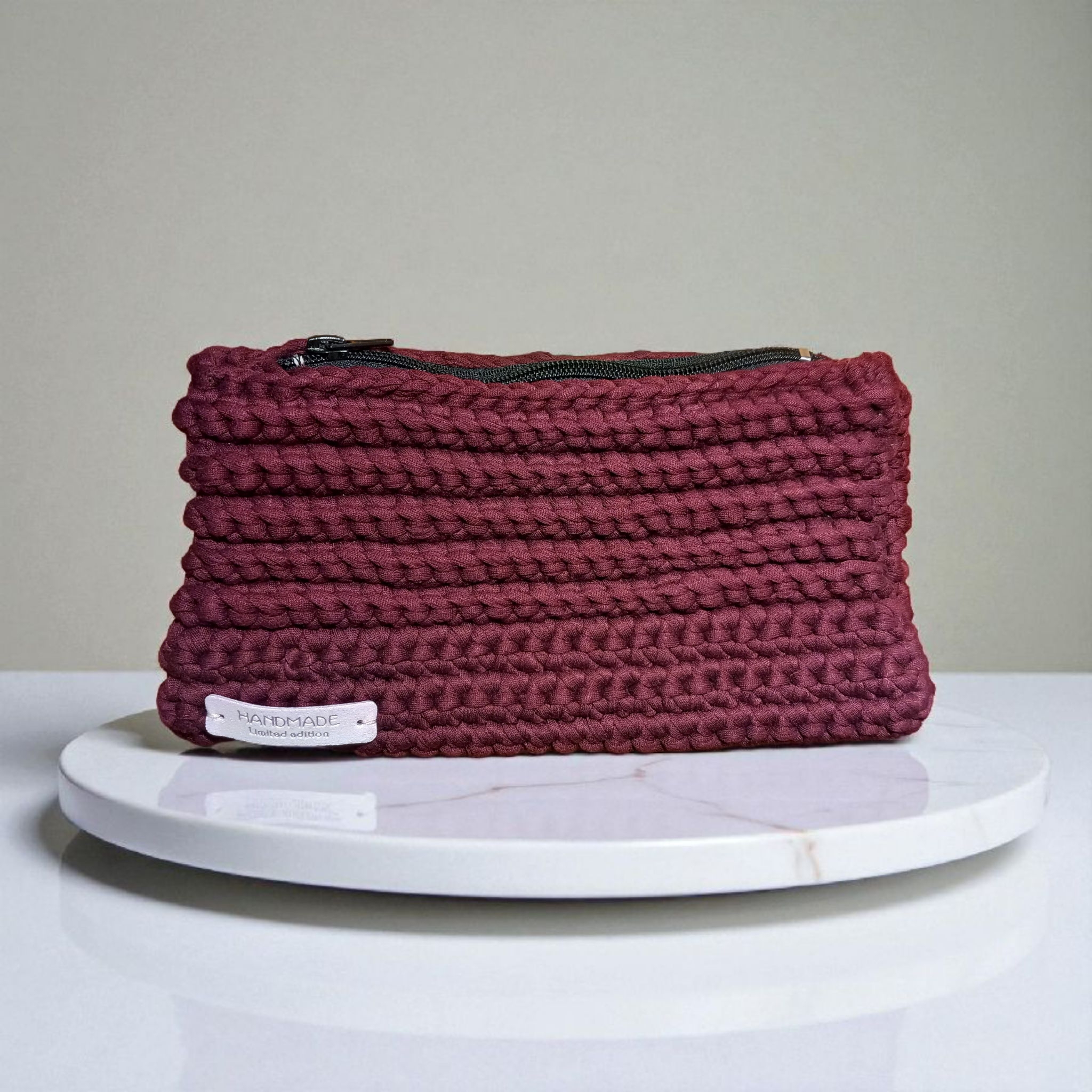 Εντυπωσιακή χειροποίητη πλεκτή τσάντα φάκελος, κατασκευασμένη με βελονάκι Νο 8 από 100% βαμβακερό μακό νήμα σε βαθύ μελιτζανί χρώμα, που αποπνέει κομψότητα και χαρακτήρα.