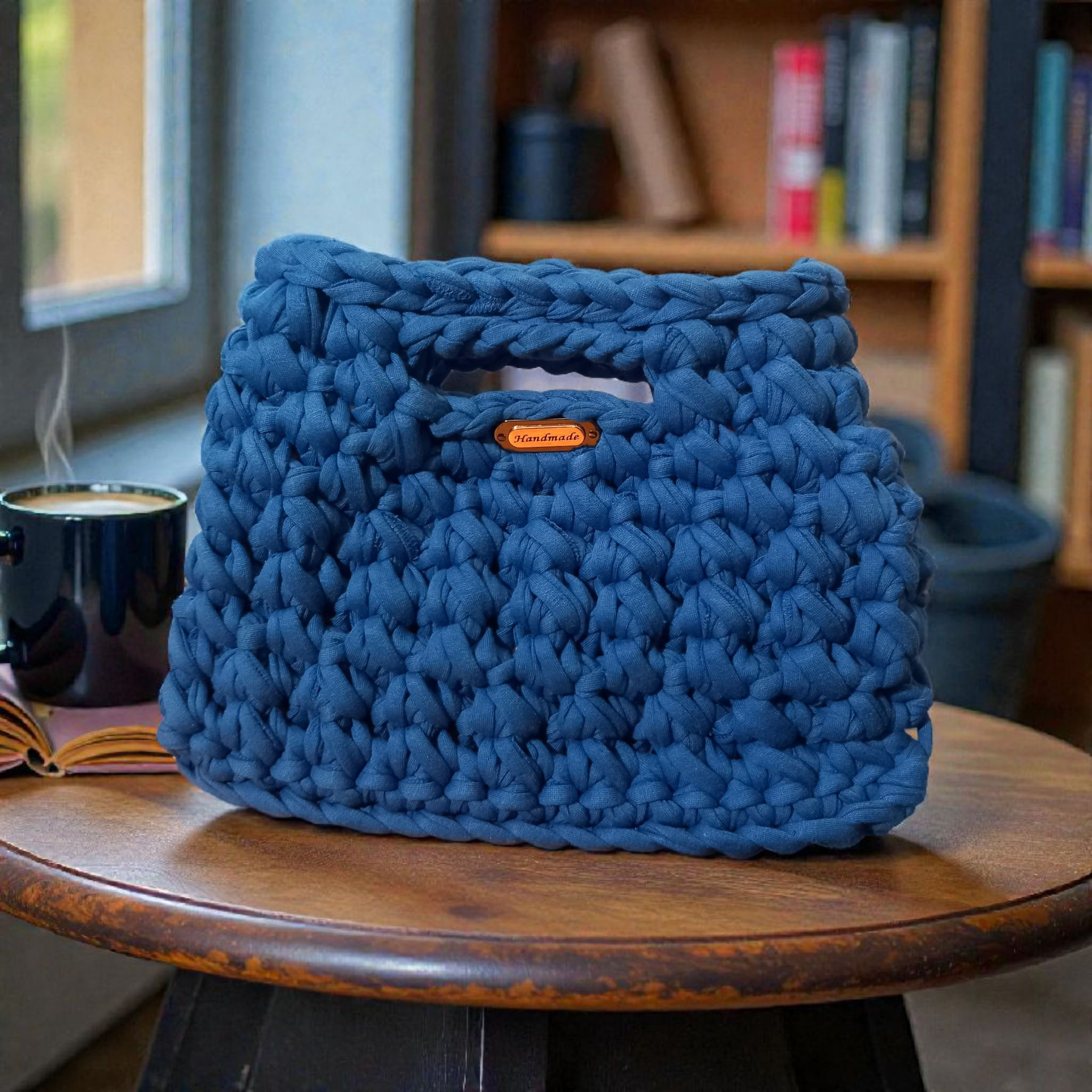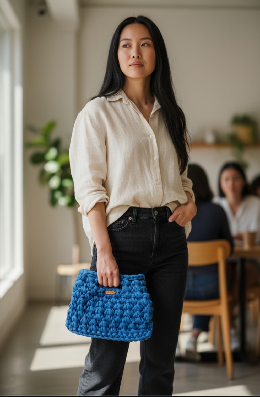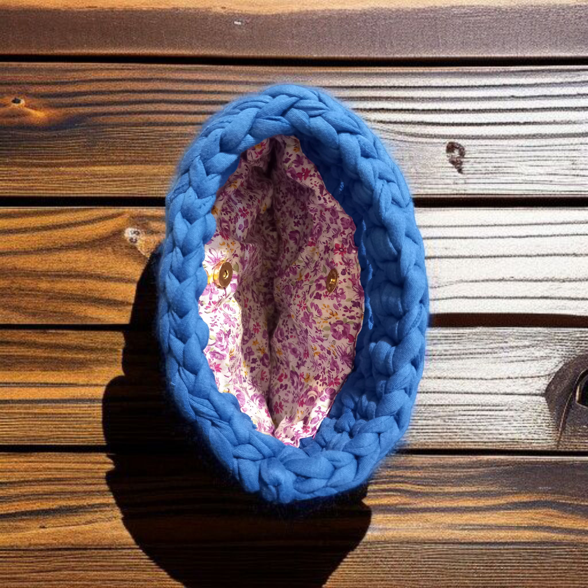 Κομψή χειροποίητη πλεκτή τσάντα φάκελος από 100% βαμβακερό μακό νήμα σε έντονο μπλε ρουά, πλεγμένη με βελονάκι Νο8, που συνδυάζει ανθεκτικότητα και απαλότητα στο άγγιγμα.