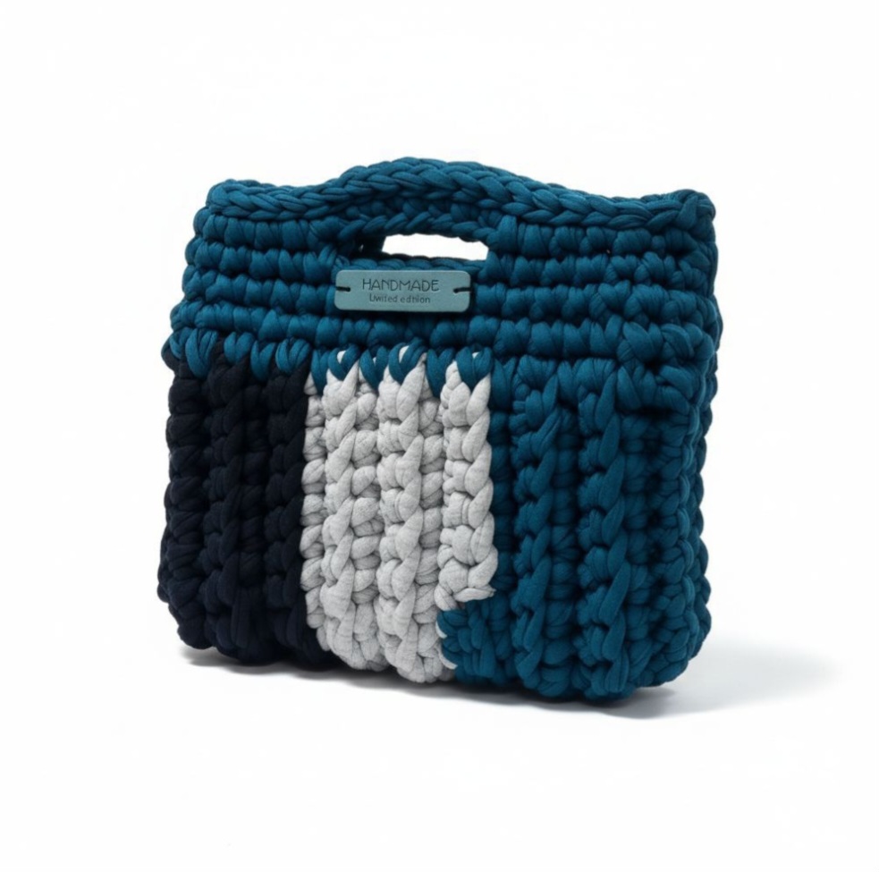 Κομψό χειροποίητο τριχρωμο τσαντάκι σε ανοιχτό γκρι, μαύρο και πετρόλ, πλεγμένο με βελονάκι Νο8 από 100% βαμβακερό μακό νήμα, που του χαρίζει απαλή υφή και σταθερότητα.