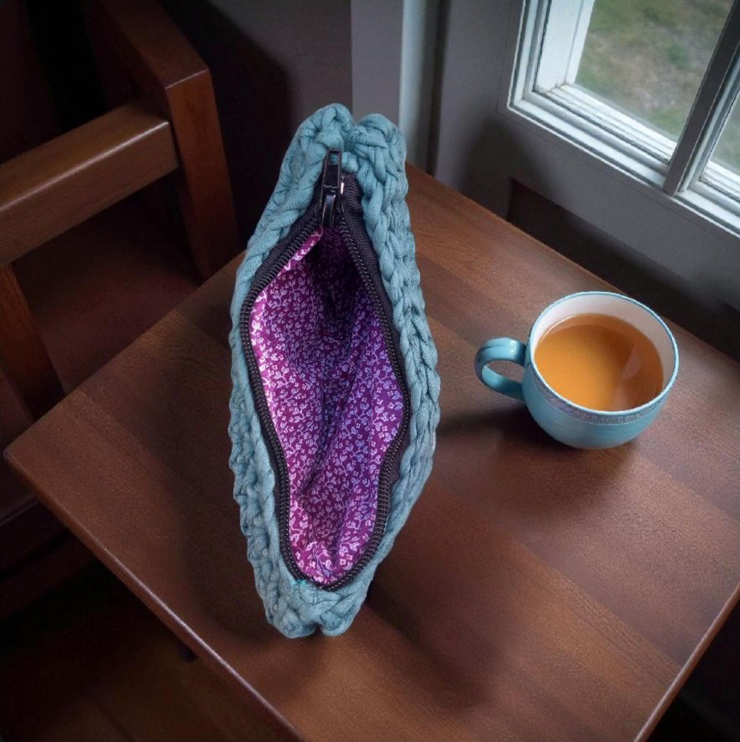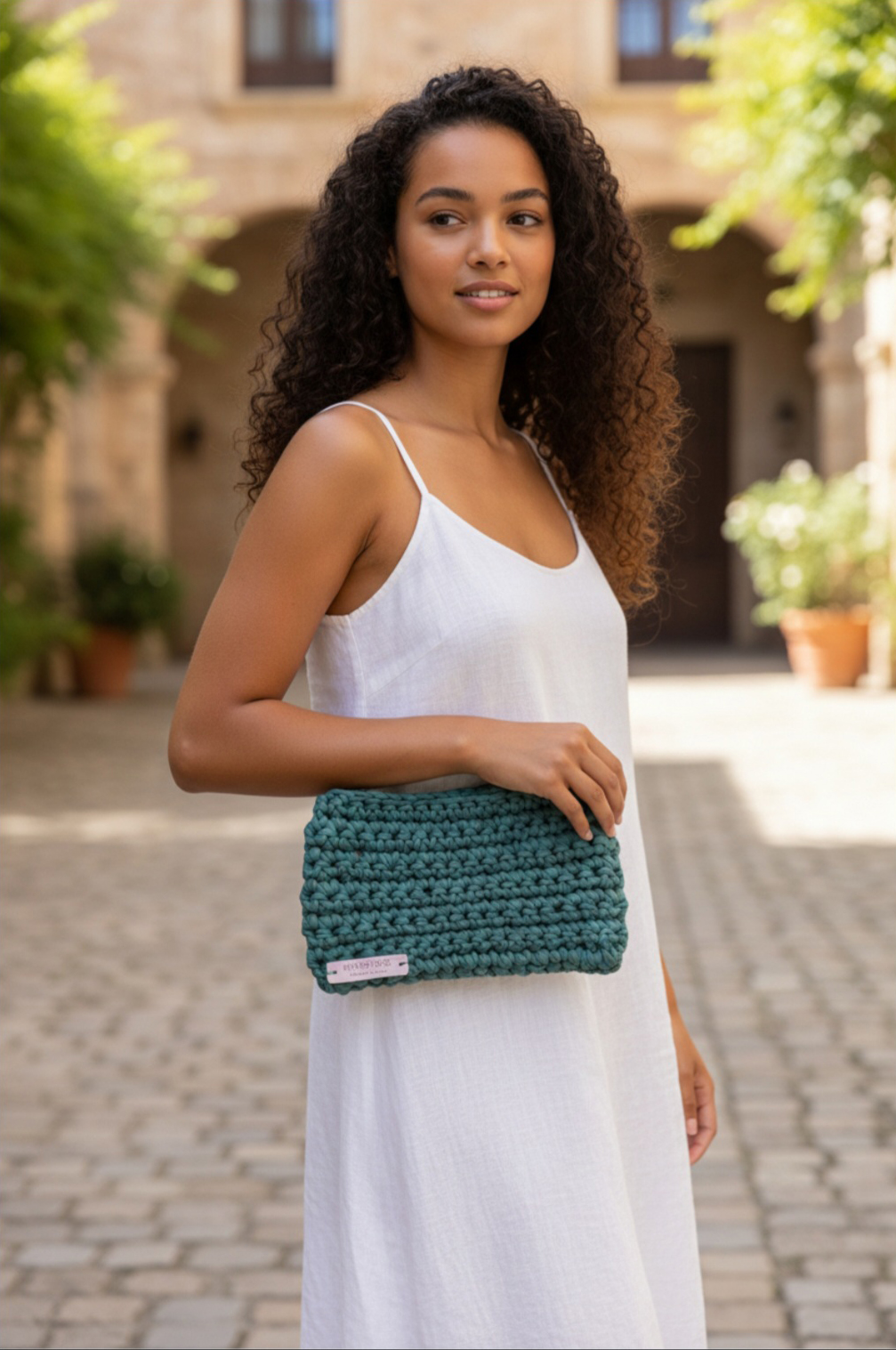 Κομψή χειροποίητη τσάντα φάκελος σε χρώμα τσαγαλί, πλεγμένη με βελονάκι Νο8 από 100% βαμβακερό μακό νήμα, που προσφέρει απαλή υφή και σταθερότητα.