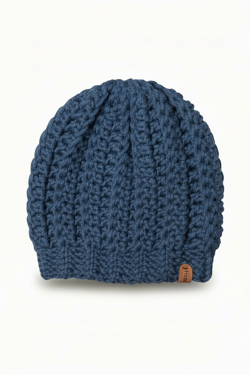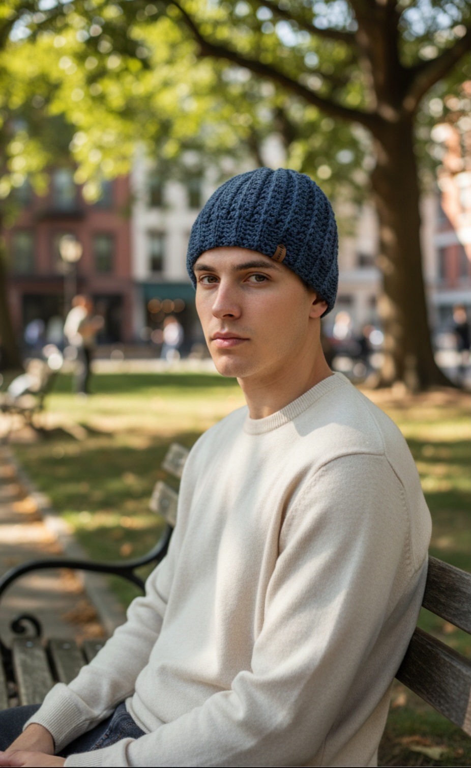 Χειροποίητος ανδρικός σκούφος σε μπλε-γκρι, φτιαγμένος με μεράκι και βελονάκι Νο6 από χοντρό, αφράτο νήμα 50% μαλλί και 50% ακρυλικό, που προσφέρει εξαιρετική ζεστασιά και ελαστικότητα.