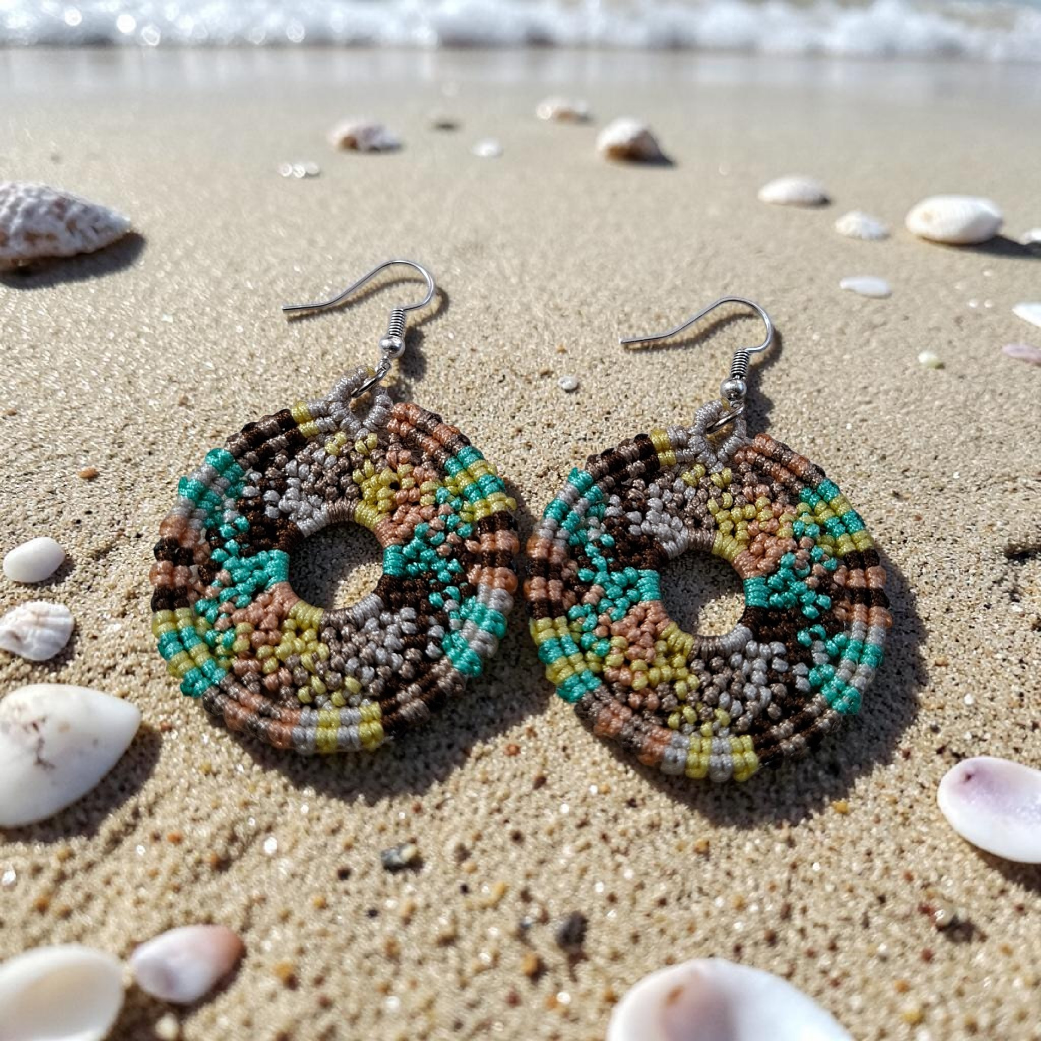 Χειροποίητα Σκουλαρίκια Μακραμέ “Mosaic Circle” – Earthy & Turquoise Tones