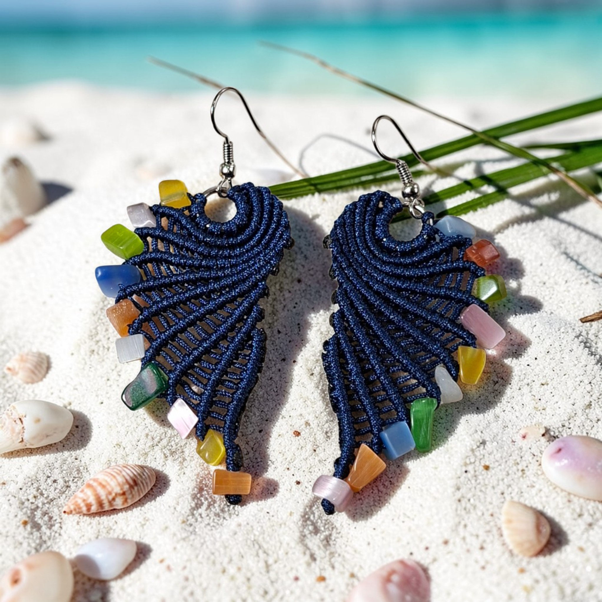 Χειροποίητα Σκουλαρίκια Μακραμέ “Ocean Wing” – Navy Blue & Rainbow Stones