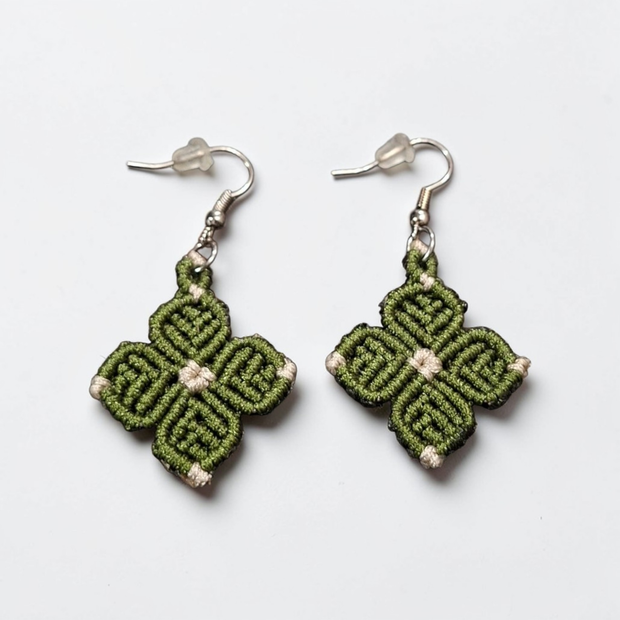 Χειροποίητα Σκουλαρίκια Μακραμέ “Olive Clover” – Moss Green & Sand