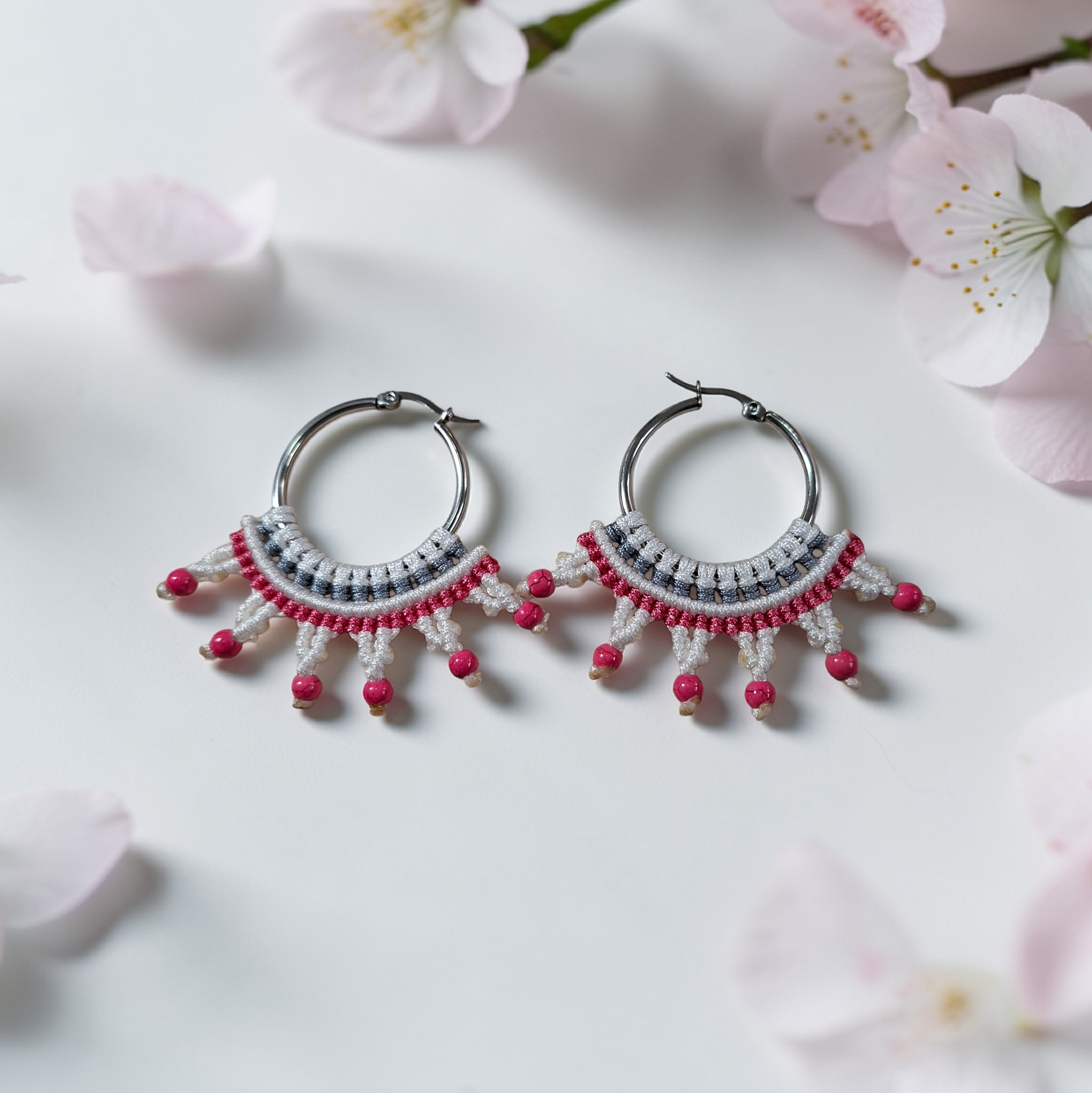 Χειροποίητοι Κρίκοι Μακραμέ “Sakura Blossom” – White & Fuchsia Accent